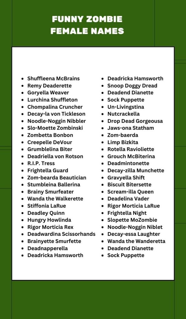 - Ghastly Grace: Blending the familiar female name, Grace, with the typical zombie trait of being ghastly brings forth amusement by juxtaposing the elegance associated with Grace against the horror of a ghastly zombie.