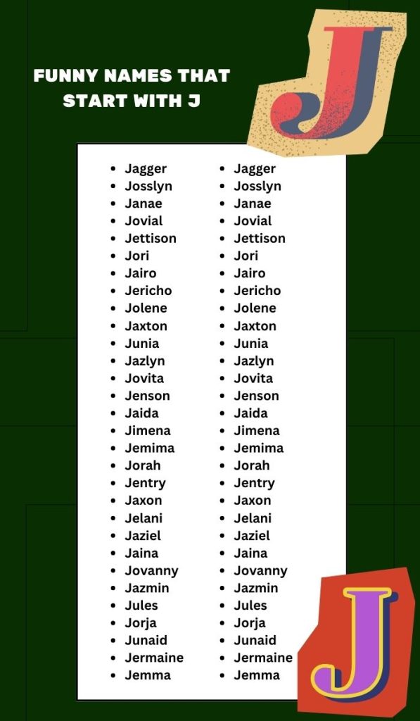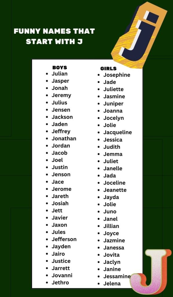 It is not clear why many people are always attracted to names that start with the letter J, but it seems that most of the names that start with the letter J sound sexy and are easy to craft funny names from. From adult to child and pet, everything can be given a name that starts with J.