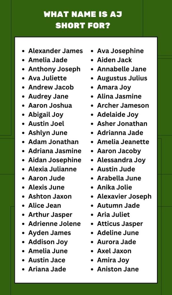 AJ is a versatile abbreviation for a myriad of full names, each with its own distinct charm. Here’s a list of common full names that are often shortened to AJ, with variations and potential regional differences: